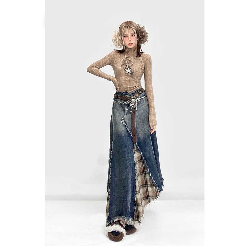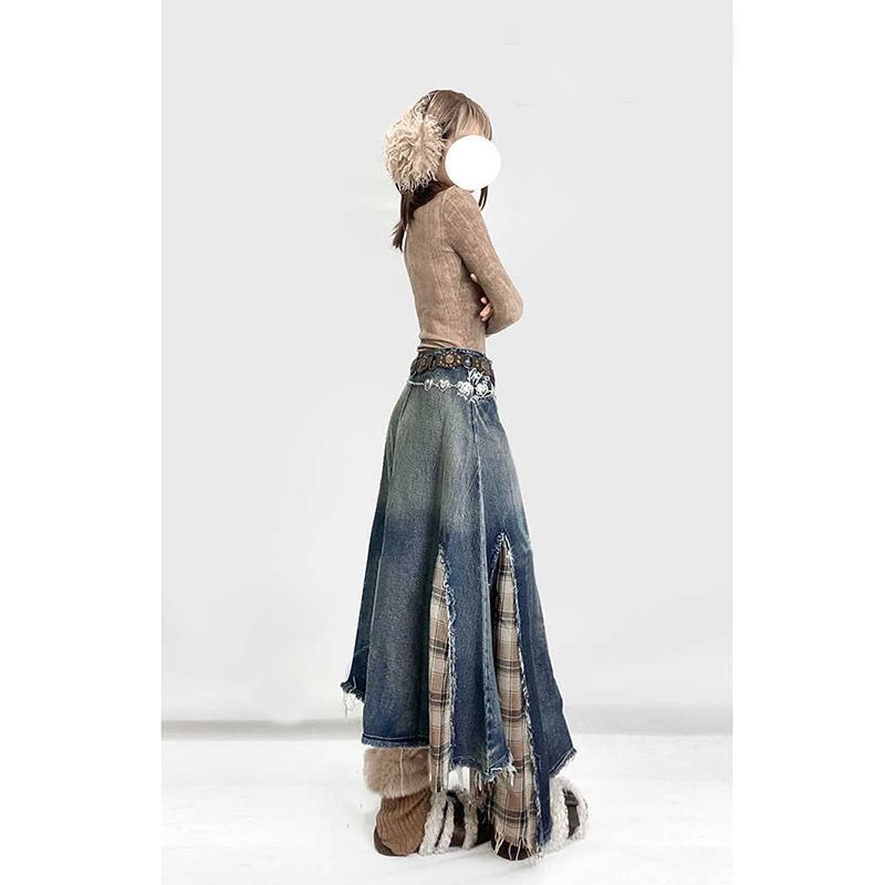 デニム素材とチェック柄生地を組み合わせた個性的なデザインのロングスカートです。