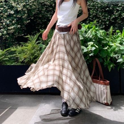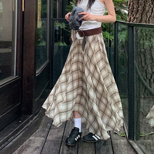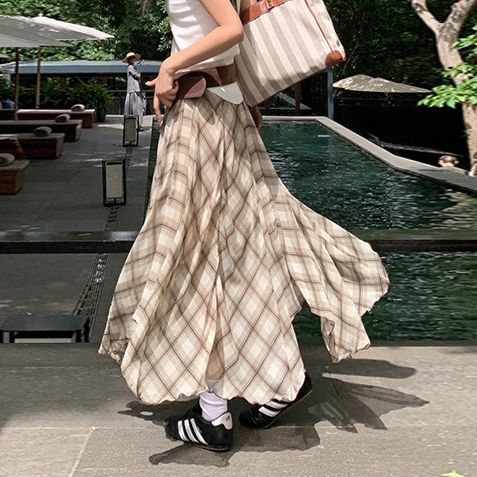 優雅に揺れるプリーツが美しいチェックスカートのロング丈デザインです。